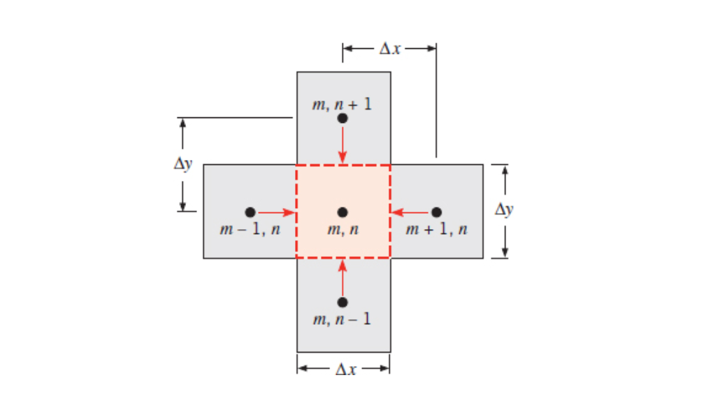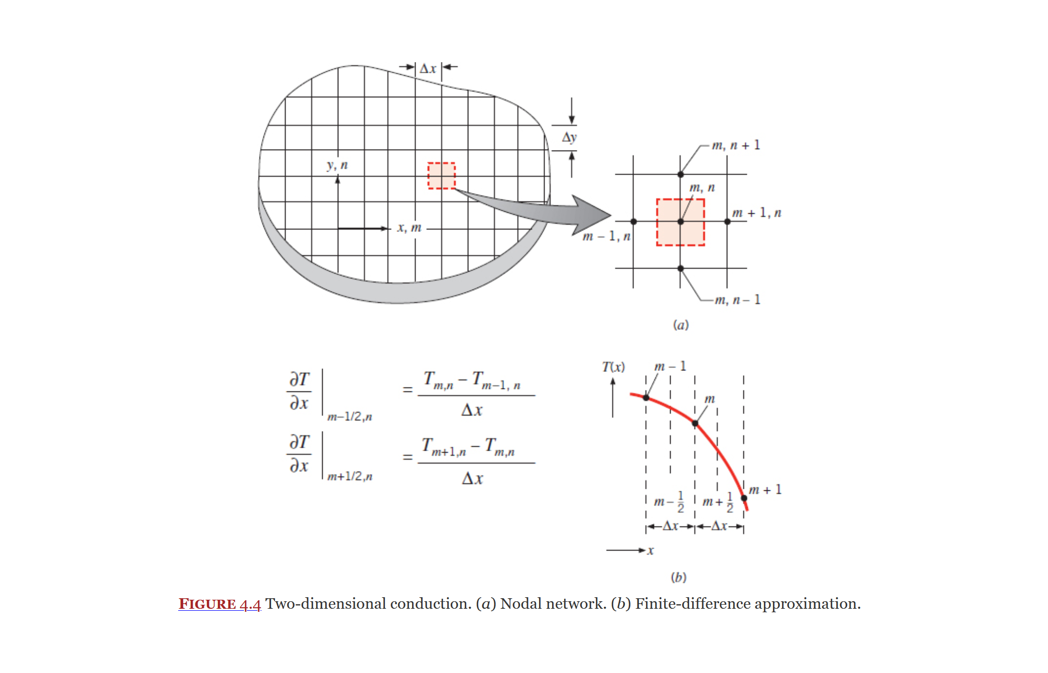 The item you want to analyze is sectioned into nodes (an interior node is shown below), from there the heat transfer rate into and out of the node is balanced.